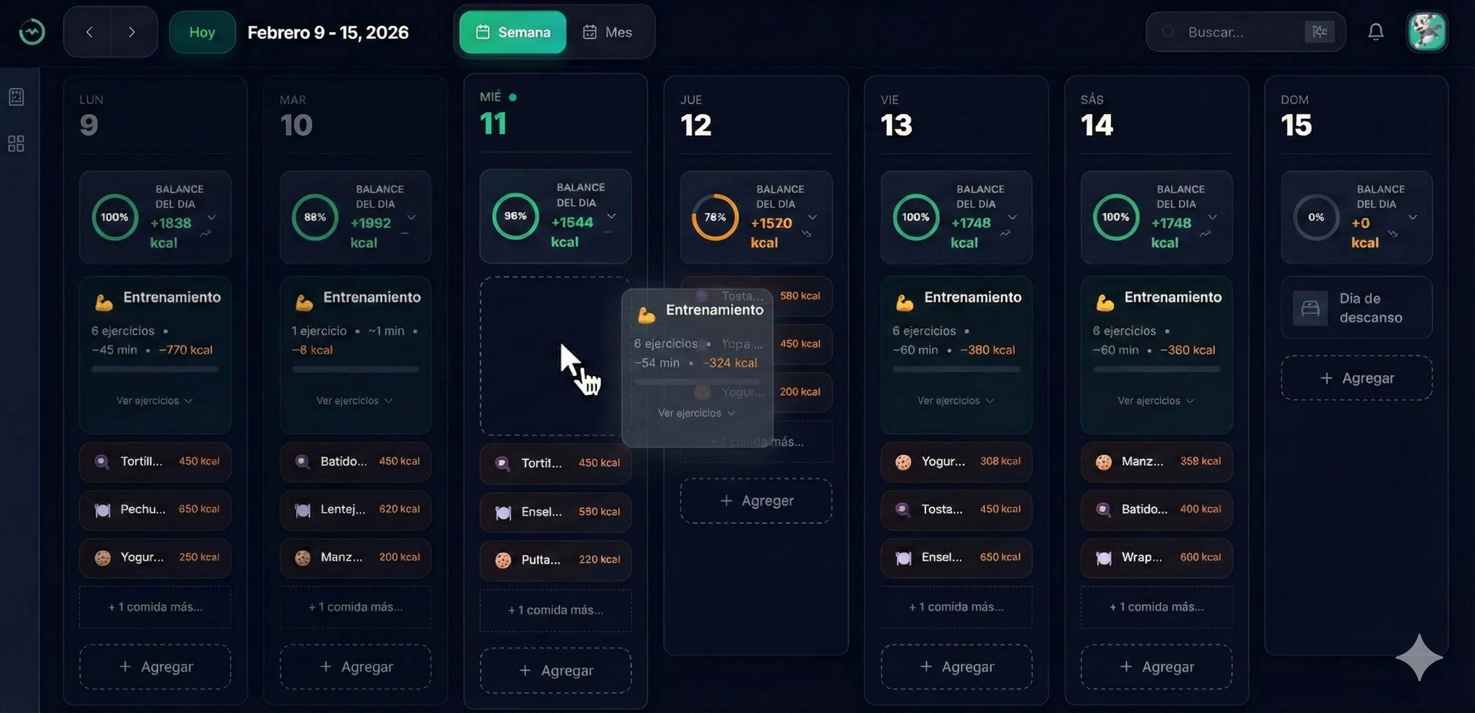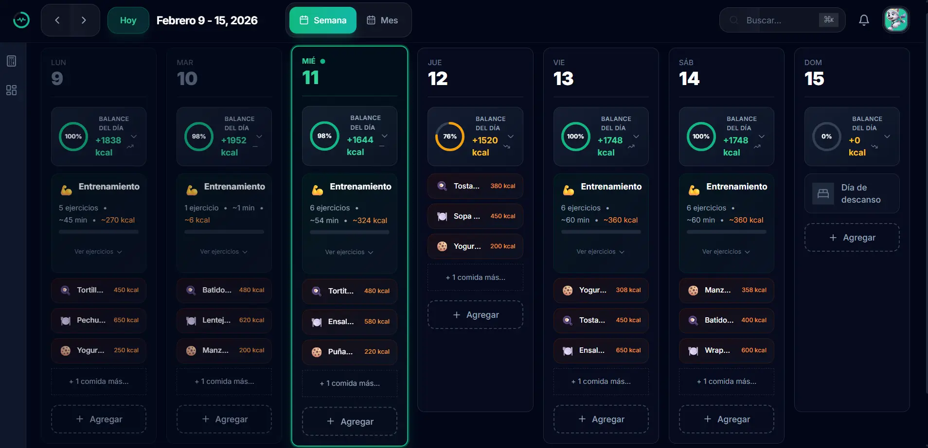 Tu semana se crea automáticamente: comidas, entrenos y recomendaciones adaptadas a tu objetivo. Todo editable y conectado entre sí.