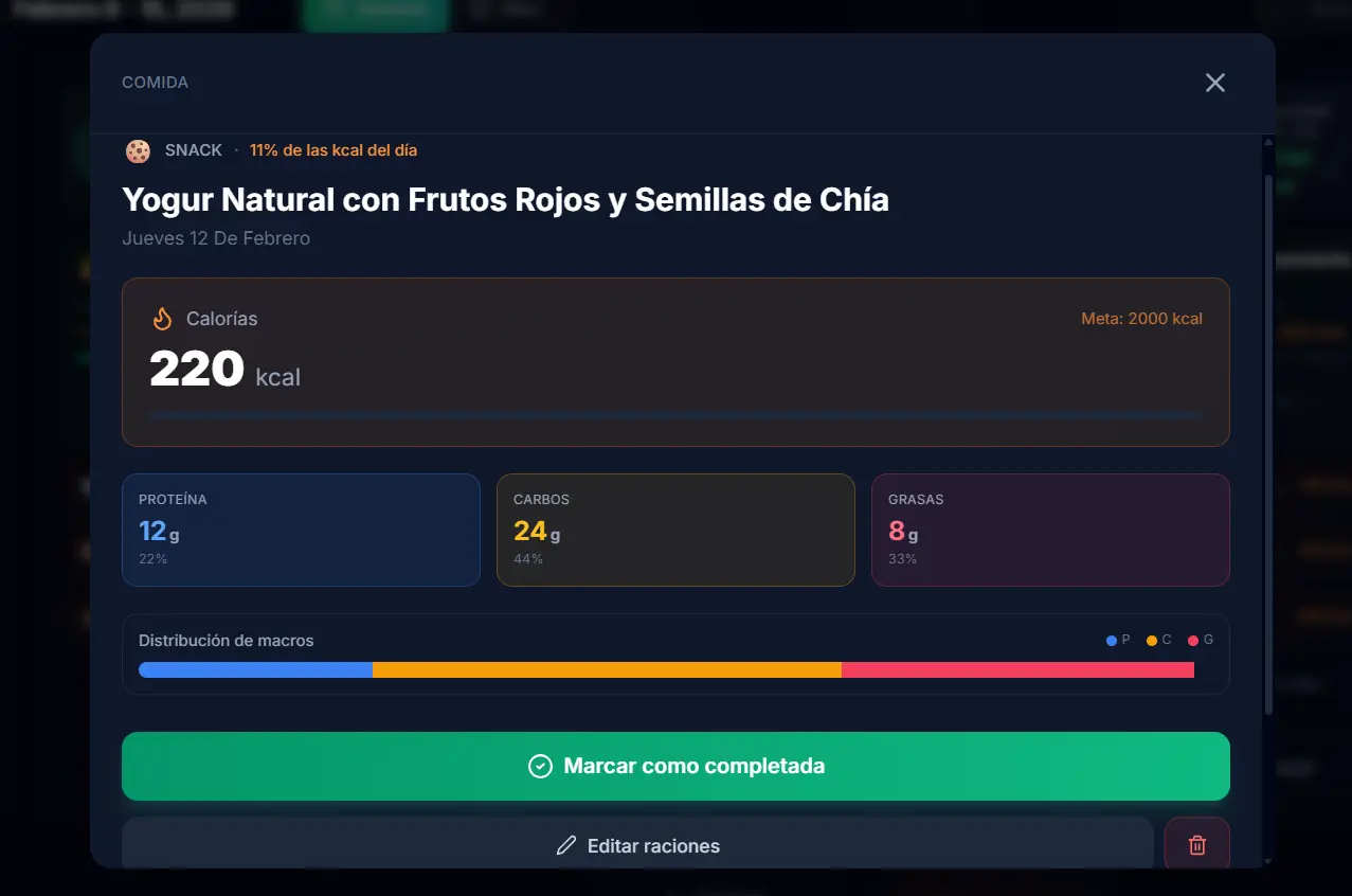 Marca qué comidas y entrenos completaste. Esto permite medir adherencia real y sirve como insumo directo para la IA.