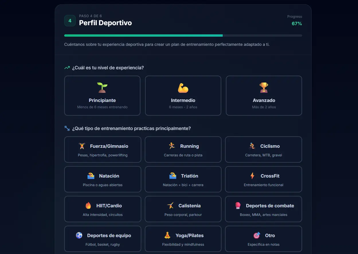 En solo 3 minutos configuramos tu metabolismo, objetivos, disponibilidad semanal, preferencias alimentarias y nivel deportivo. Esto genera el primer borrador del plan.