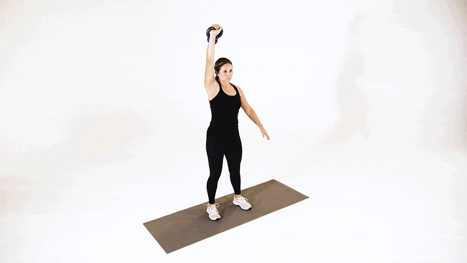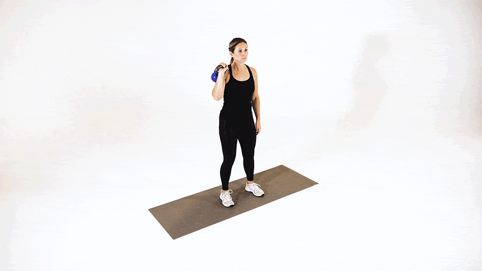 Desde el suelo o entre las piernas, levanta la kettlebell explosivamente con una mano, permitiendo que rote sobre la palma abierta hasta la posición de rack (kettlebell en el hombro).