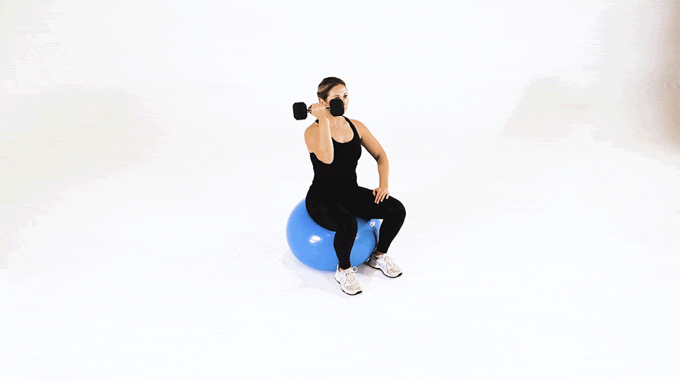Manteniendo el brazo recto o ligeramente flexionado, eleva la mancuerna hacia adelante hasta la altura de los hombros.