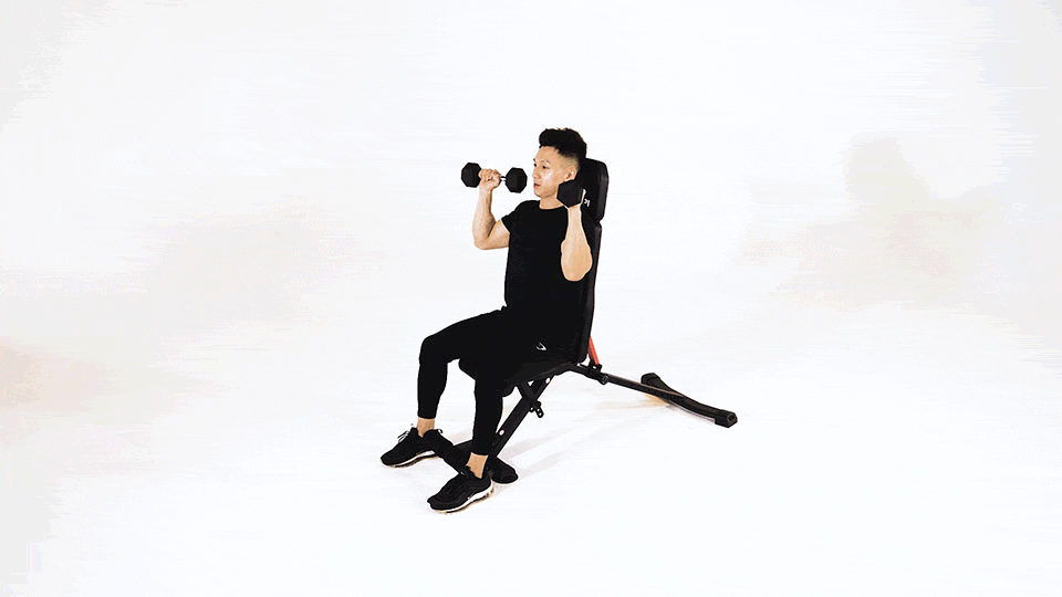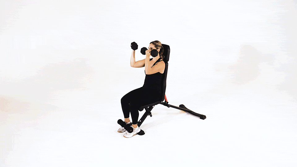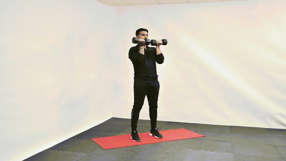 De pie, sostén mancuernas con los brazos extendidos frente a ti y elévalas lentamente hasta la altura de los hombros, manteniendo los brazos estirados.