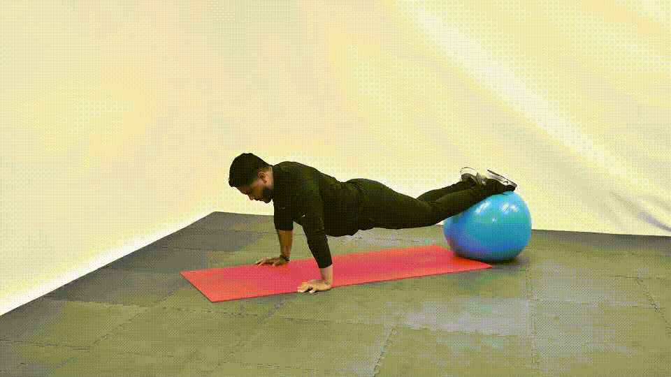 Colócate en posición de flexión con las manos en el suelo y los pies apoyados en un balón suizo.