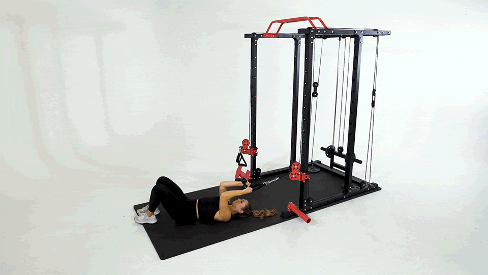 De pie frente a una máquina de poleas con el cable en posición alta y una empuñadura simple.