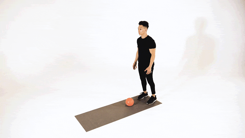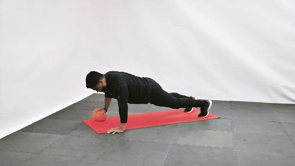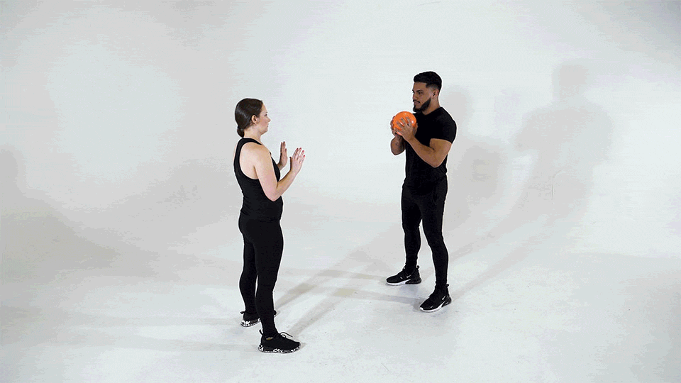 Sostén un balón medicinal a la altura del pecho.
