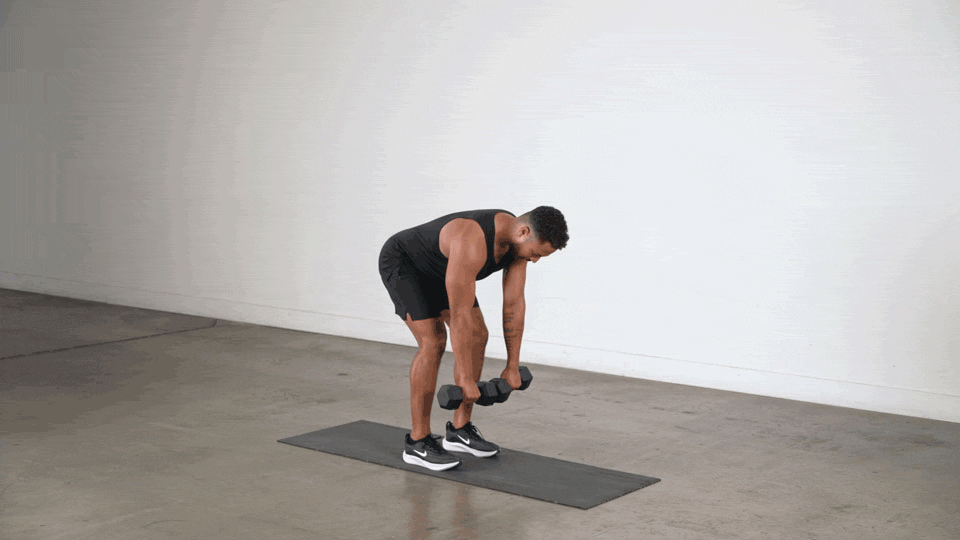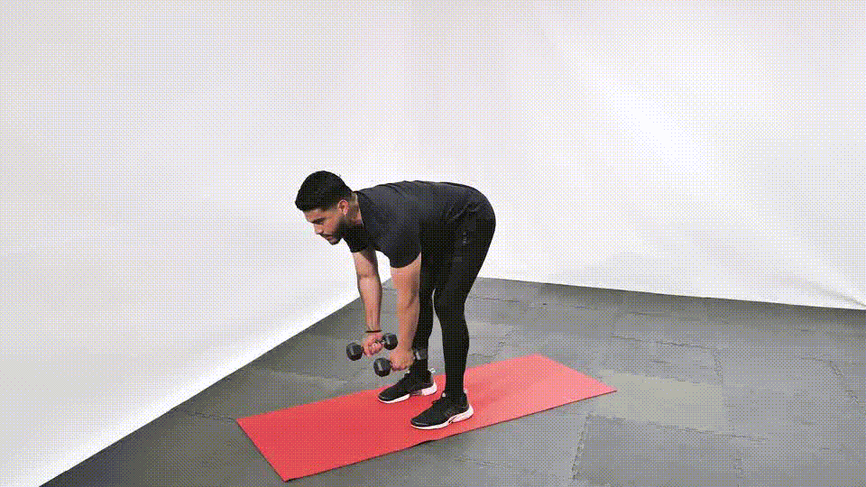 Sostén una mancuerna en cada mano con los brazos extendidos hacia el suelo.