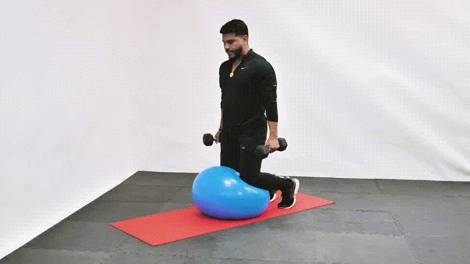 Curl de Bíceps de Rodillas con Mancuernas en Balón de Estabilidad