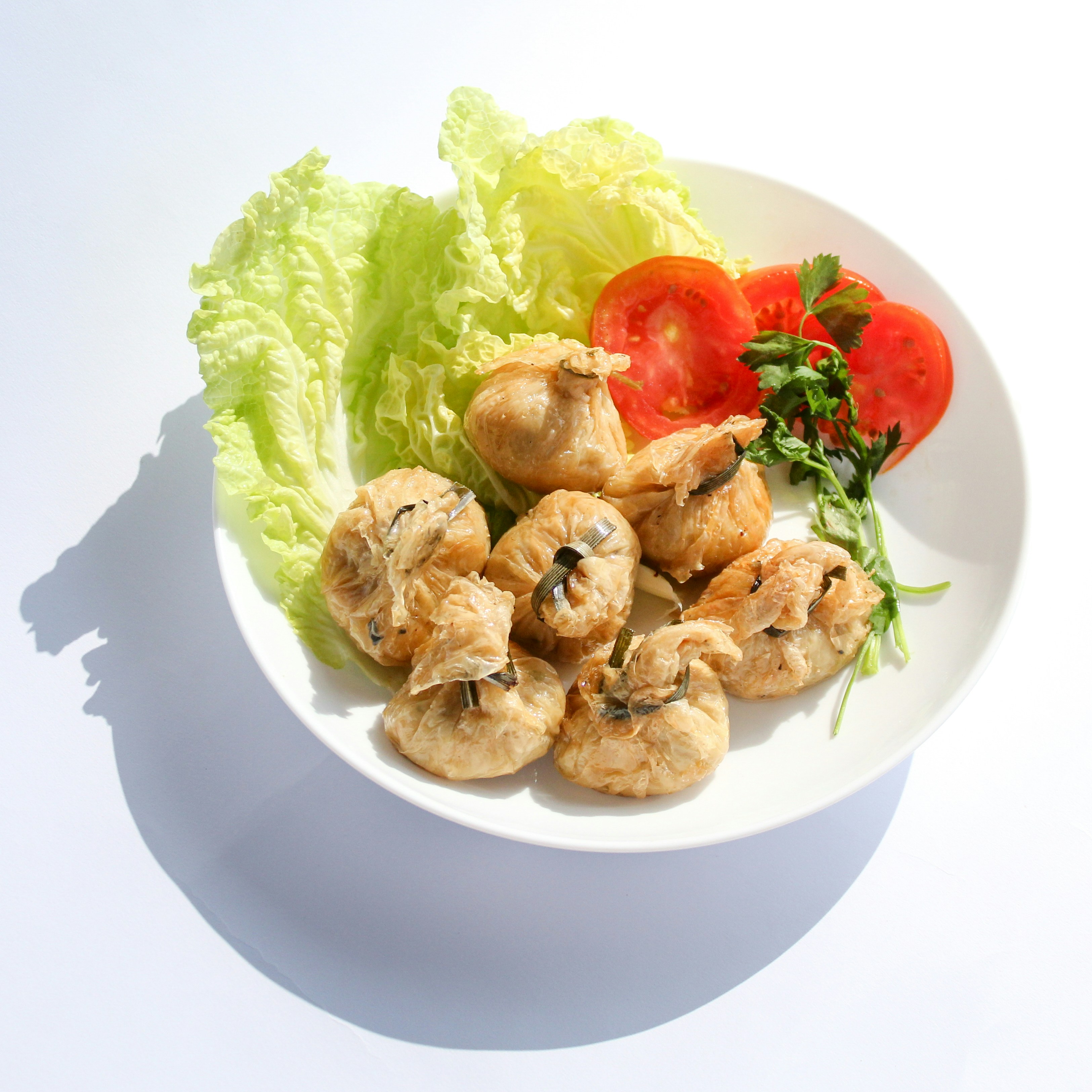 Coloca una cucharada del relleno de pollo y vegetales en el centro de la masa.