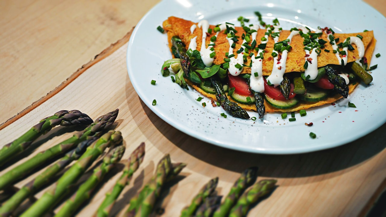 Lava y corta parte dura de espárragos. Saltea con aceite 5-7 minutos hasta tiernos.