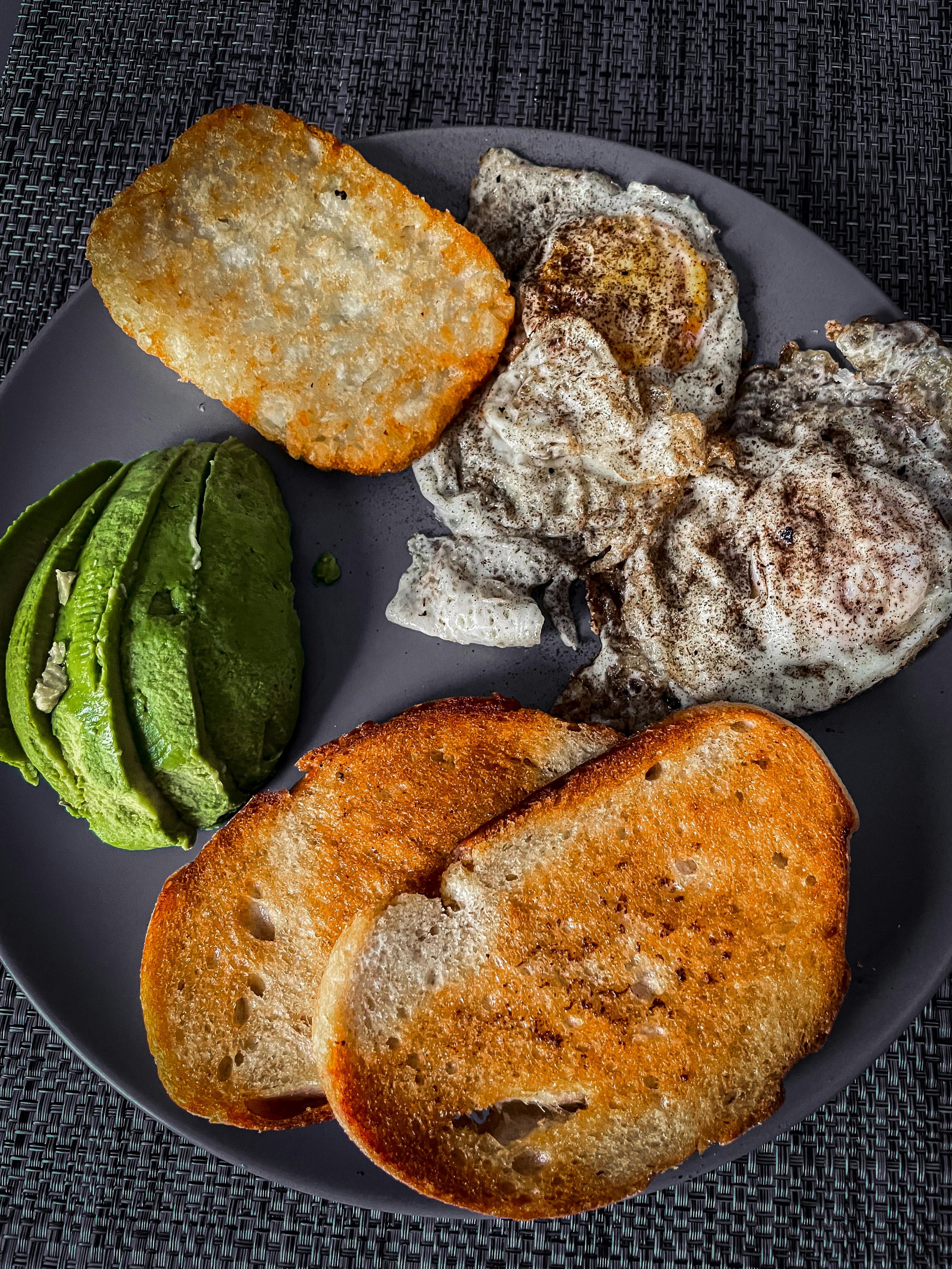 Coloca un huevo sobre cada tostada con salsa. Acomoda las rebanadas de aguacate al lado de los huevos.