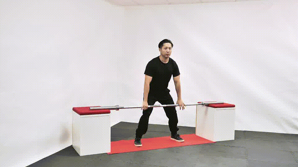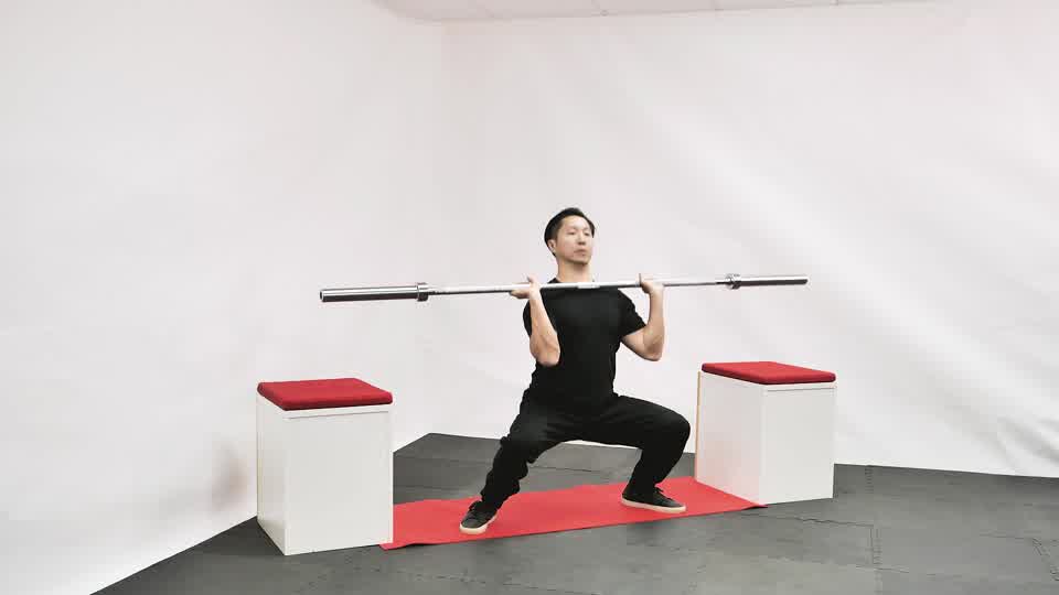 Levanta la barra desde el suelo en un movimiento explosivo por encima de la cabeza, dividiendo las piernas en una estocada al recibir la barra.