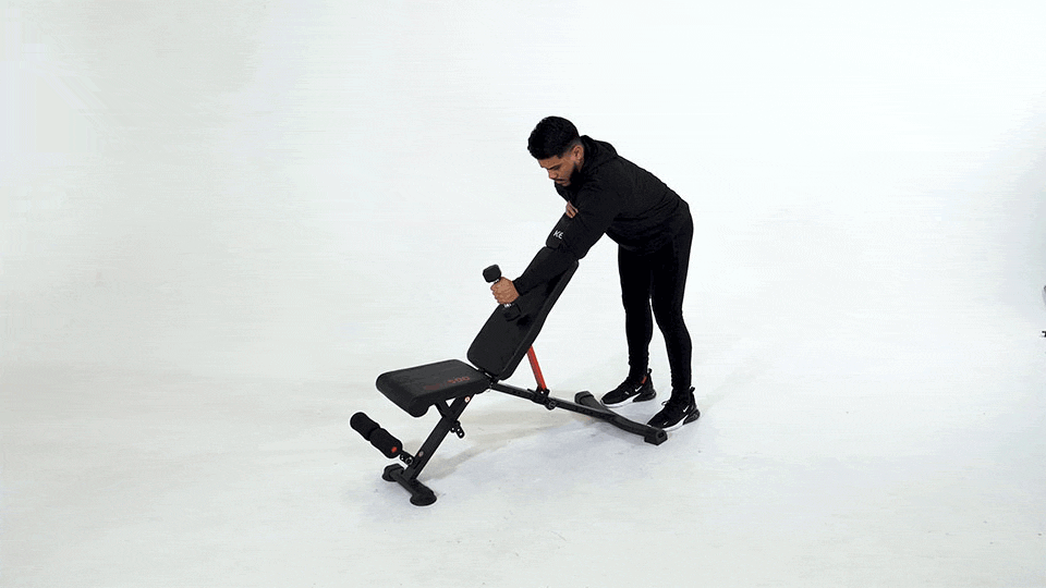 Siéntate en el banco predicador con la parte superior de los brazos apoyada firmemente.