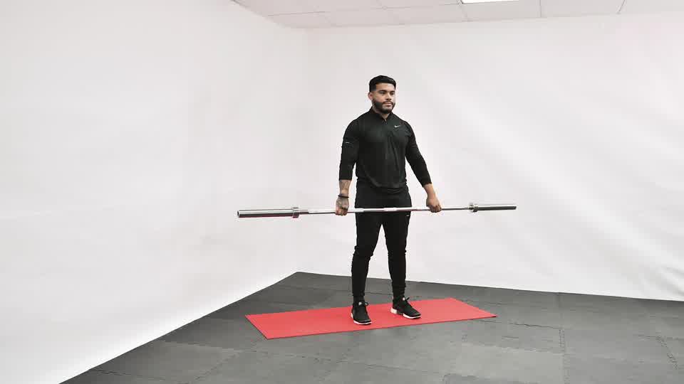 De pie, con los pies a la anchura de los hombros, agarra la barra con un agarre prono y estrecho (dentro del ancho de los hombros).