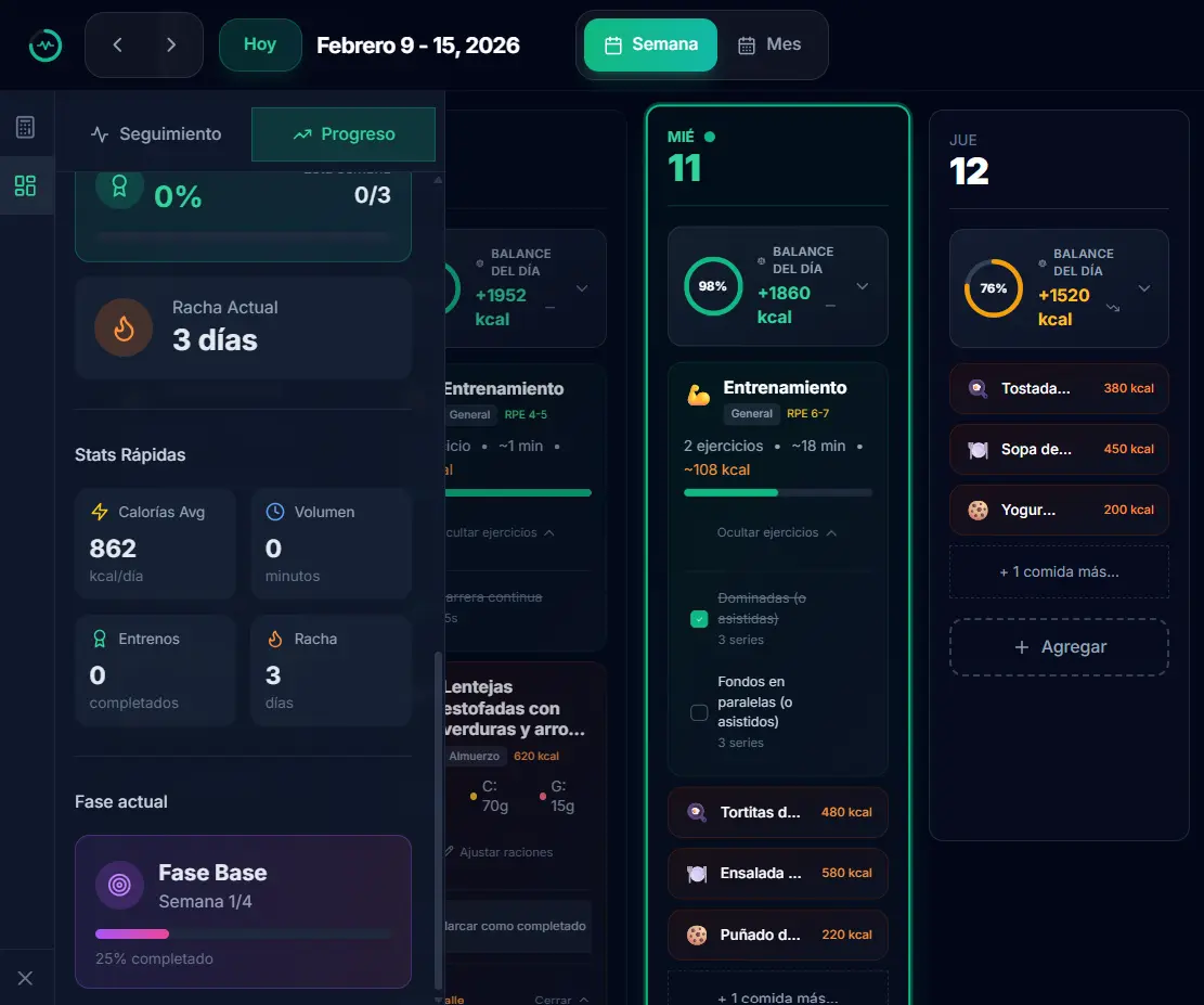 Marca cada comida o entreno como completado, parcial u omitido. La IA usa estos datos para ajustar tus calorías, volumen y sesiones futuras.